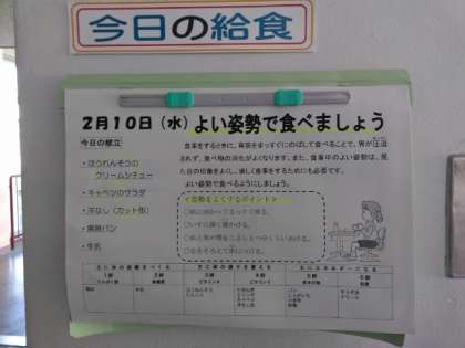 本日のメニューは、「ほうれん草のクリームシチュー」「キャベツサラダ」デザートは「洋なし」です。
