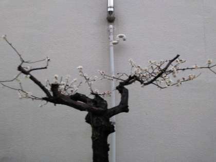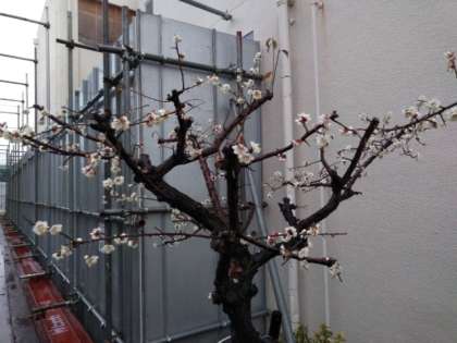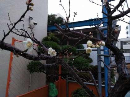 満開が近づいてきた校庭の寒梅。