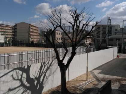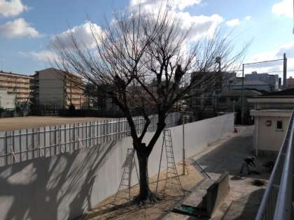 営繕作業の二日目。作業班の皆様が、グラウンドの欅(けやき)に登って、