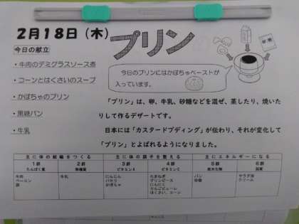 今日のメニューは、「牛肉のデミグラスソース煮」「コーンと白菜のスープ」「かぼちゃのプリン」です。