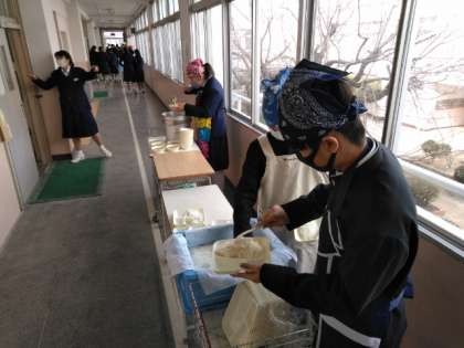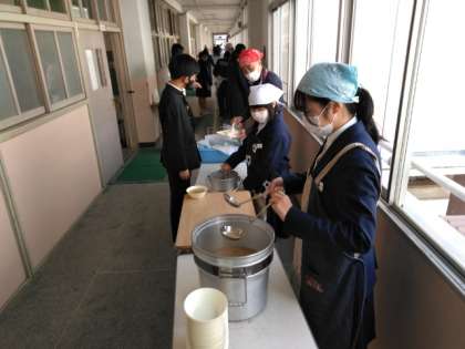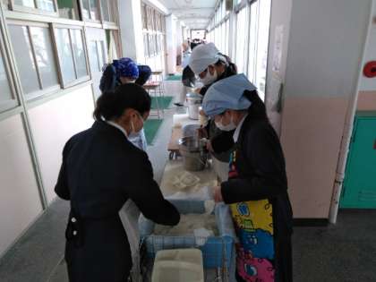 午前の授業が終了し、給食の準備に取りかかります。