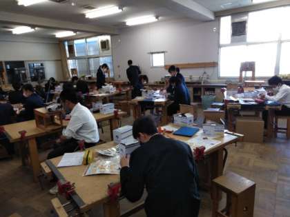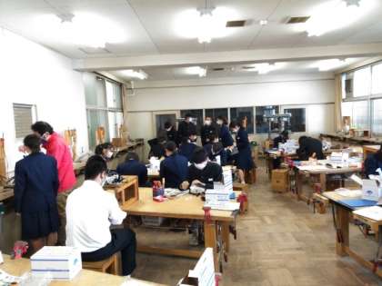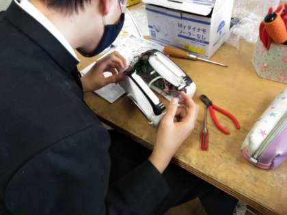 ラジオの作成。はんだづけなど、細かな作業をかさね、ていねいに仕上げています。