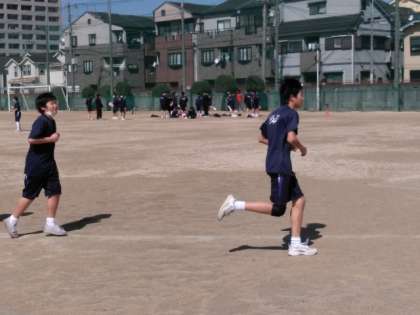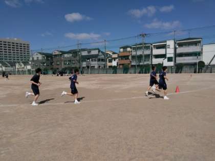 グラウンドでは、男子が半袖姿で持久走に挑んでいます。