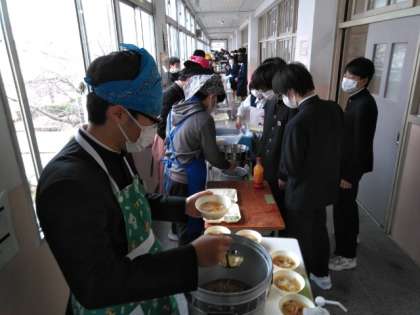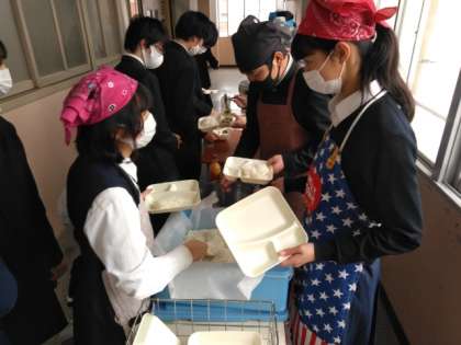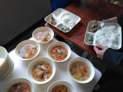 午前の授業が終わり、給食の準備が始まりました。