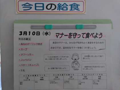 今日のメニューは、「豚肉のガーリック焼き」「鶏肉と野菜のスープ」「キャベツのサワーソテー」です。