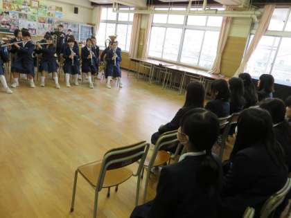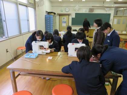 部活動体験の様子です。下の写真はそれぞれバトミントン部・吹奏楽部・家庭科部の活動の様子です。吹奏楽部では、まず先輩の演奏を聴いて、次に楽器の演奏体験をしていました。家庭科部ではミシンの使い方を先輩の部員がしっかりと指導していました。