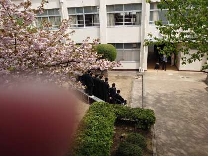 3時間目の時間に各学級写真撮影が行われています。 中庭の桜を背景に撮影を行っています。
