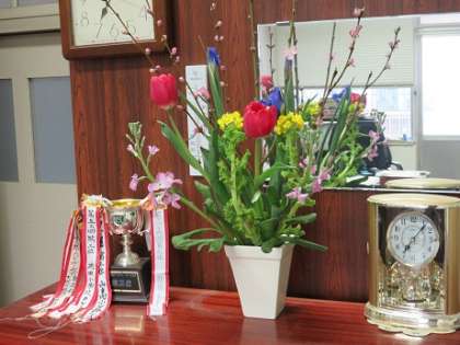 2ケ月に一度地域の皆さんが本校の和室でフラワーアレンジの作品づくりをされています。いつも終了後に校長室に作品をプレゼントしていただいています。今回はチューリップなど春の花のおかげで校長室がとても明るくなりました。ありがとうございます。写真の左にありますカップは、住吉区PTAバレーボール大会第三位のカップです。