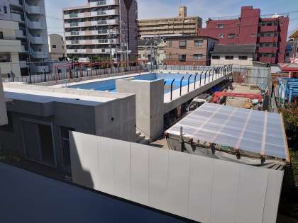 ご覧の通り工事は進んでいますが、まだまだ時間がかかります。ろ過装置等を設置し、プールに水を張って試運転し、となると、どうやら夏休みまでには難しい状況です。