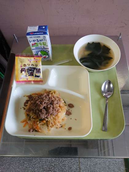 本日の給食の献立は、 ビビンバ トック 牛乳 いり黒豆 です。