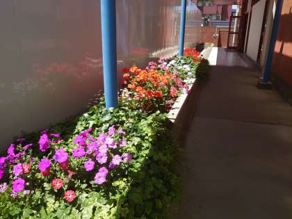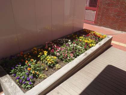 正門を入り、体育館前にはたくさんの花が咲いています。