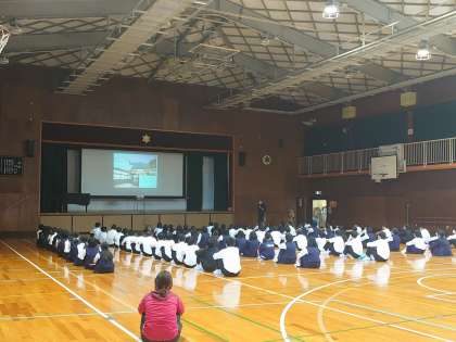 学年主任の岡田先生より、6月16・17日に予定している一泊移住について、パワーポイント等を使って説明がありました。