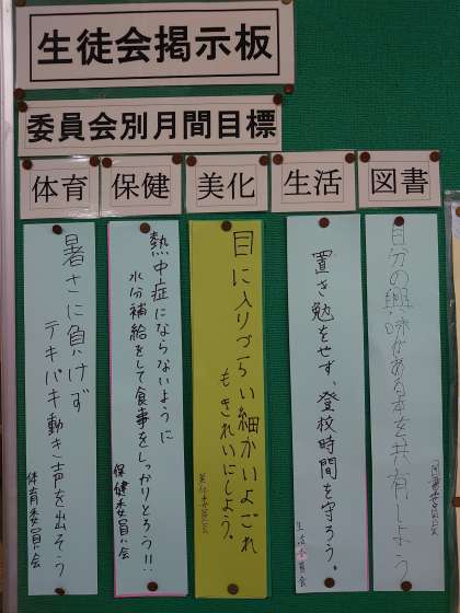 生徒会掲示板に委員会別の月間目標が掲示されています。