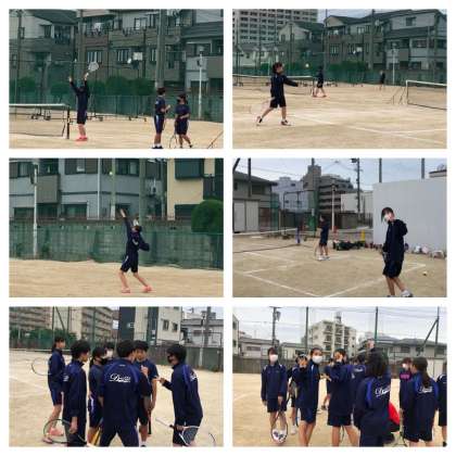 グラウンドでの部活動の練習様子です。硬式テニス部が練習しています。2、3年生はシングルス対決をしていました。上級生はさすが!鋭いサーブを打っています。1年生もペアを組んでミニゲームを行っていました。