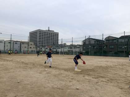 グラウンドでの部活動の様子です。野球部が練習しています。バッティングから守備練習を行っていました。スライディングするも、ベースに届かず、3年生の先輩がアドバイスするシーンがありました。