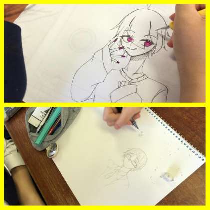 和気あいあいと、黒板やスケッチブックに思いおもいの絵を描いたり、コンクールに出す作品を考えています。