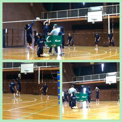 ブロック、レシーブ、トス、スパイクの練習をしています。