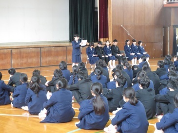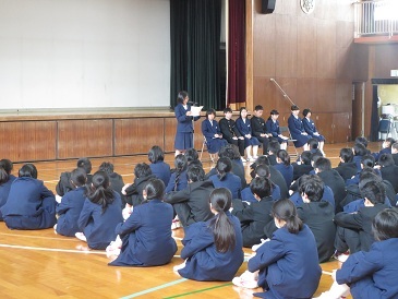 平成26年度も終わりに近づいてきました。本日3月16日(月曜日)は6時間目に平成27年度の生徒会選挙のための立会演説会が開かれました。平成26年度の生徒会役員のみなさんありがとうございました。4月からは、2年生が最高学年になり、新入生の模範とならなければなりません。その先頭に立って生徒会を運営するのが会長以下5名の生徒会役員のみなさんです。会長・副会長・執行委員に立候補したみなさんは、それぞれ大きな声でしっかりと演説していました。演説を聞く態度もとてもよかったと思います。