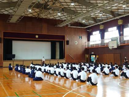 集会では弘田先生より、時間を守ることやトイレのスリッパをそろえること、など、ちょっとした心がけ、心遣いが大切で、その意識を向上してほしい。勉強も大事だが、みんなの心の成長を先生方は願っている、というお話がありました。