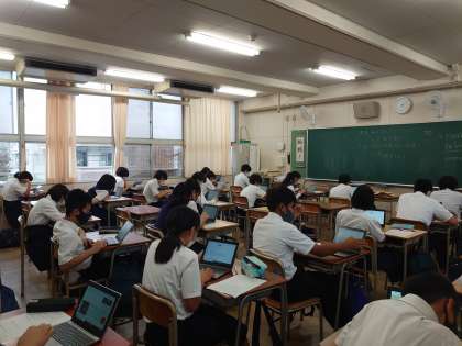2年生は6時間目、平和学習に向けて、学習者用端末を活用した調べ学習を行いました。