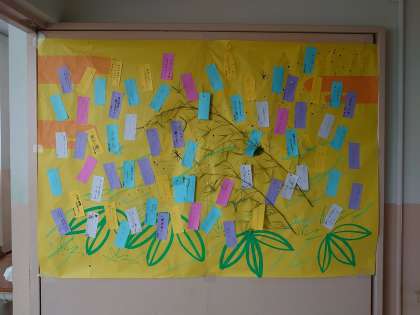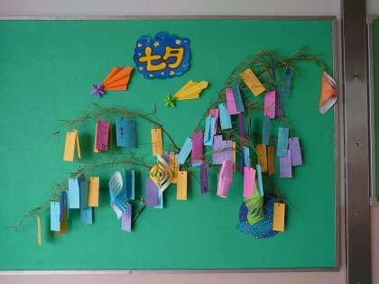 今日はいよいよ七夕。残念ながらあいにくの天気になってしまいましたが、生徒のみなさんの短冊への願いはかなり増えました。