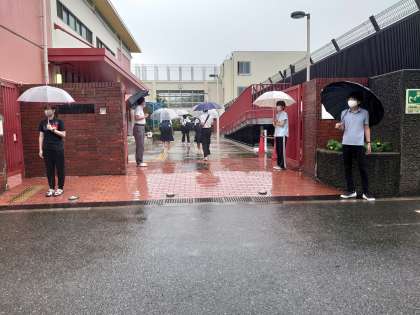 生徒のみなさんの登校時間は雨脚が強く、傘を差しながらの登校となりました。