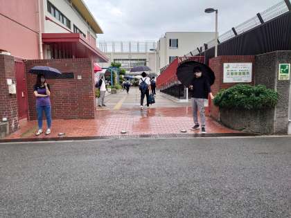今朝は、早朝から小雨が降るという天候でしたが、登校時刻あたりになると少し雨が強くなってきました。