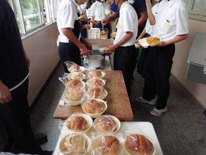 今日の献立にスパゲッティがあります。生徒のみなさんの好きなメニューのひとつで、受けとる顔にも笑顔が見られていました。