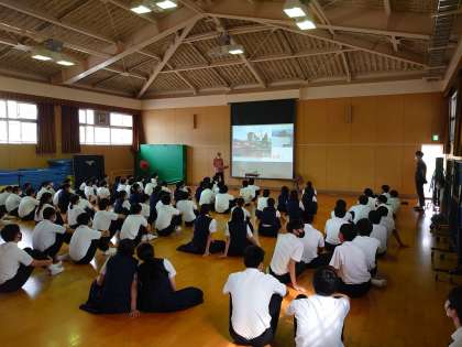 スライドや動画などを活用し、修学旅行でどのようなところへ行くのか、どのような体験をするのか、などについての説明がありました。