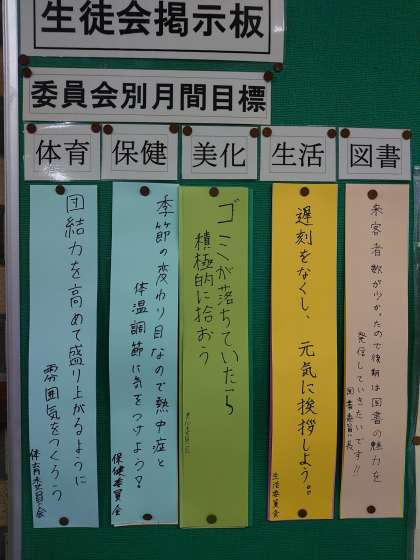 生徒会掲示板に各種委員会の月間目標が掲示されています。