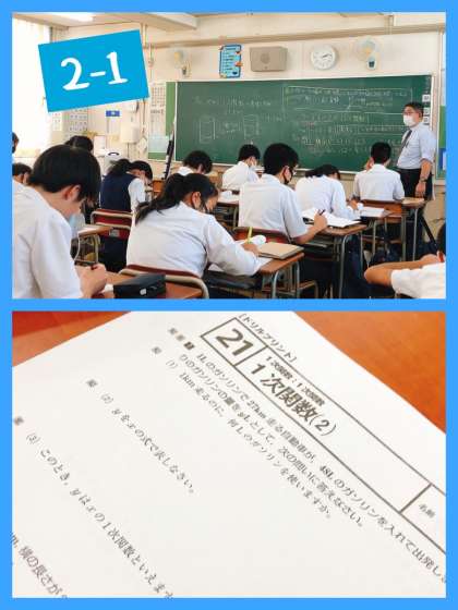 2-1は数学。一次関数について学習しています。問題に取り組み、分からないところは先生に聞いています。
