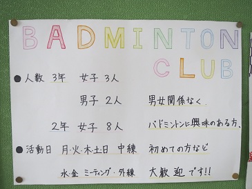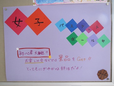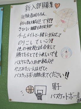 校内にはクラブ活動の入部勧誘のポスターが掲示されています。ポスターからクラブの様子などもうかがえます。ぜひ多くの生徒のみなさんがクラブに入部して充実した中学校生活を送ってくれることを期待しています。