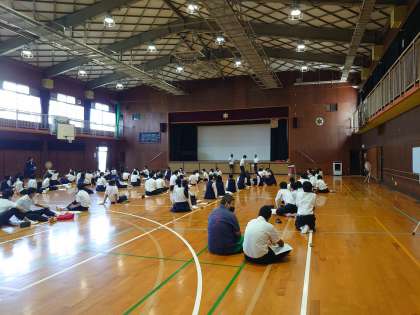 3時間目、約10日後に控えた一泊移住に向け、2年生は体育館、1年生は閣議室で、それぞれしおりをもとに説明がありました。