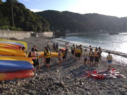 海の活動が終了し、使用したカヤックやカヌーをみんなで片付けています。