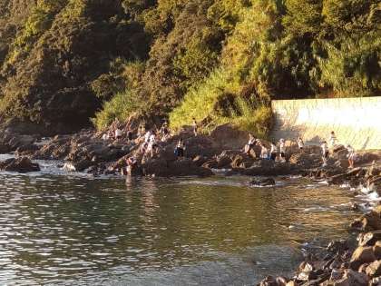 そんな中、1組は磯の観察を行っています。少し疲れている様子を見せる生徒もいますが、がんばって磯の生物を探しています。