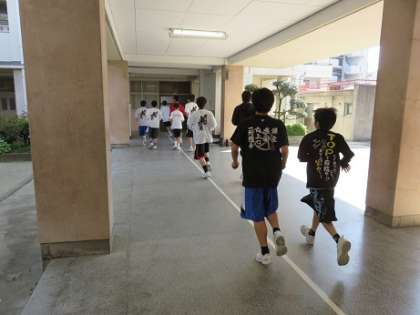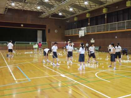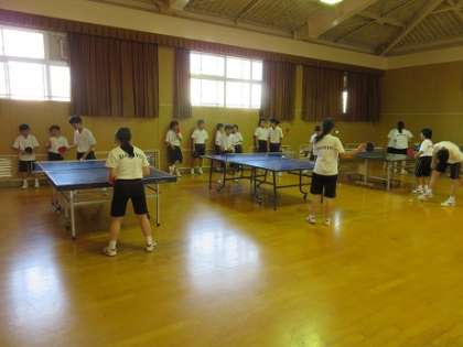 続いてバトミントン部の練習の様子です。体育館では男女バスケットボール部とバトミントン部が練習していますので、お互いに譲り合って練習に励んでいます。バトミントン部が練習している間、男子バスケットボール部は廊下を走っていました。また、卓球部は格技室で練習をしています。今では女子部員もたくさんいます。それに新入部員も多くいるため卓球台が足りないくらいです。