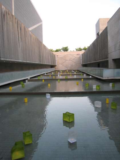 写真は大阪府立狭山池博物館の入り口、博物館全景、博物館に入る通路(左右)です。狭山池まつりのため燈籠が浮いています。