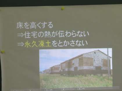 今日は1年生の社会科の授業を覗いてみました。社会科の授業ではプロジェクターを利用して、映像や写真の教材をたくさん用意して、子どもたちの理解を深める工夫をしています。子どもたちは板書の文字とともにプロジェクターの写真を食い入るように見ていました。今日の授業ではロシアの永久凍土の上に建つ家が凍土を溶かすことなく、家が傾いたりしないようにどう工夫しているかという内容でした。プロジェクターを使うことで子どもたちの興味や関心を高める効果のあることがよくわかりました。