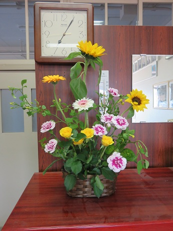 2ケ月に一度本校の和室を利用してフラワーアレンジの教室が開かれています。昨日教室が開かれて、作品が校長室にプレゼントされました。なかなか見事です。カーネーション、バラに、もうヒマワリも彩を添えています。もう夏ですね。ありがとうございます。
