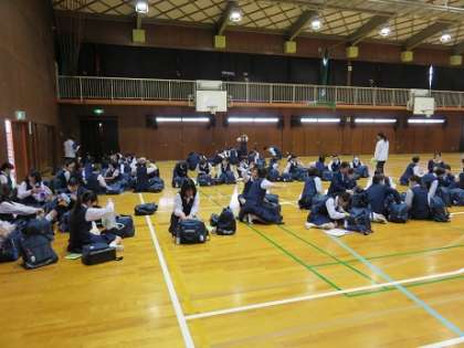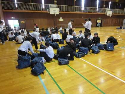 今日は、体育館で出発に向けて荷物がちゃんとそろっているかしっかりと点検しました。