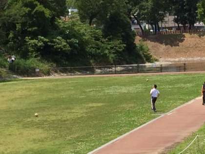 男性の先生がサッカーをしています。バスケットボールだけでなくサッカーも得意のようです。