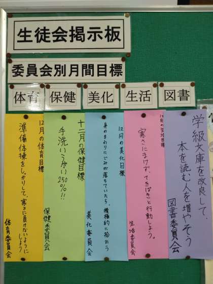 先日の各種委員会で決められた12月の目標が掲示されています。
