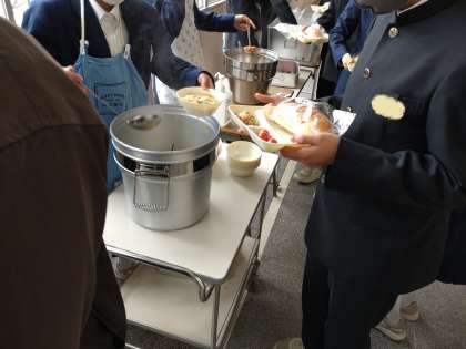 配膳係がよそってくれるおかずを受け取る生徒のみなさんの顔からもそれがうかがえます。