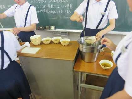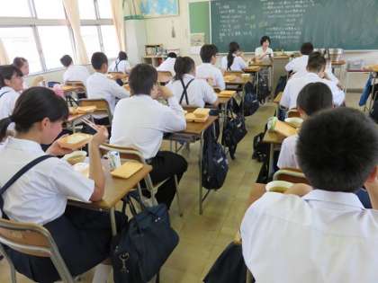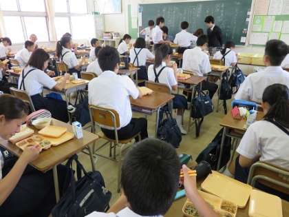 今日は2年生の給食の様子を覗いてみました。2年生の給食は、配膳員の方が2階の教室の近くまで、配膳棚で給食を運んでいただいています。給食係りが、その給食を教室に運んで、食べています。今日のメニューは・さごしのごま焼き・鶏肉とじゃがいもの煮もの・高野どうふのいり煮・れんこんのきんぴら・すまし汁でした。静かに食べていました。今日から教育実習が始まりましたので、実習生もスーツ姿で緊張しながら指導に加わってくれていました。教育実習は今日から3週間の予定です。