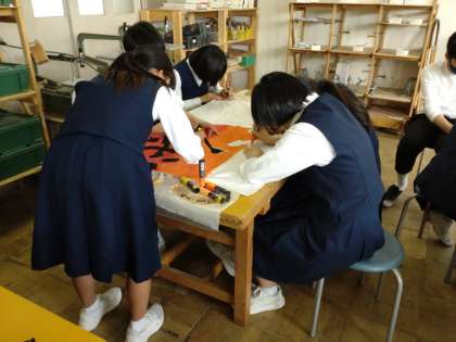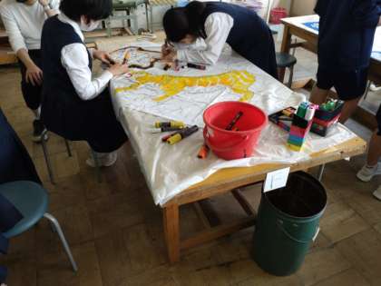 2階から1階へ降り、美術室の様子を見ますと、6月27日に予定しています体育大会の学級旗を作成していました。