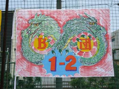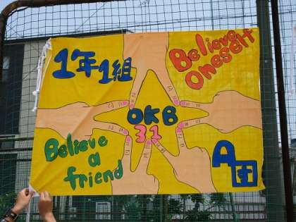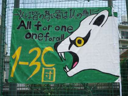 今回の体育大会は雨のため開始が遅れましたが、生徒参加の演技・競技はすべて実施することができました。多くの地域の皆様・保護者の皆様にお出でいただきました。ありがとうございました。今日だけではすべての写真をとてもアップできませんが、学級旗から一部をご紹介します。1年1組から順に2組、3組の旗です。ご覧ください。