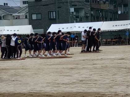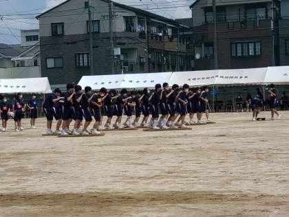 プログラム7番はムカデ競走です。4人1組で板下駄を履き、直線を駆け抜け?ます。