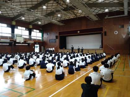 その後、今日から3週間、教育実習に来られた先生方の紹介とあいさつ、また、先日の春季総体で優勝した女子バスケットボール部の賞状伝達がありました。