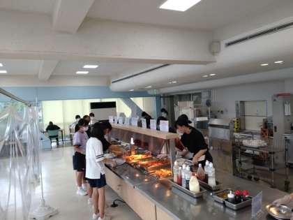 食事はバイキング形式となっており、みんなおかずを皿に盛っています。