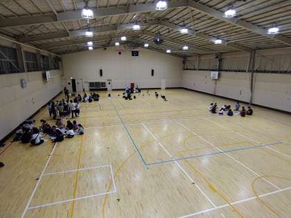 レクレーション・室内オリンピックが終了し、就寝まであと1時間。明日に向けての係会議が引き続き淡路青少年交流の家の体育館で行われています。